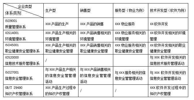 常見(jiàn)的生產(chǎn)類、銷售類、服務(wù)類、技術(shù)開(kāi)發(fā)類企業(yè),這些企業(yè)通常在做適合自身企業(yè)的管理體系時(shí)候,將會(huì)已自身的業(yè)務(wù)為基準(zhǔn),再加上體系類型的特定描述。
